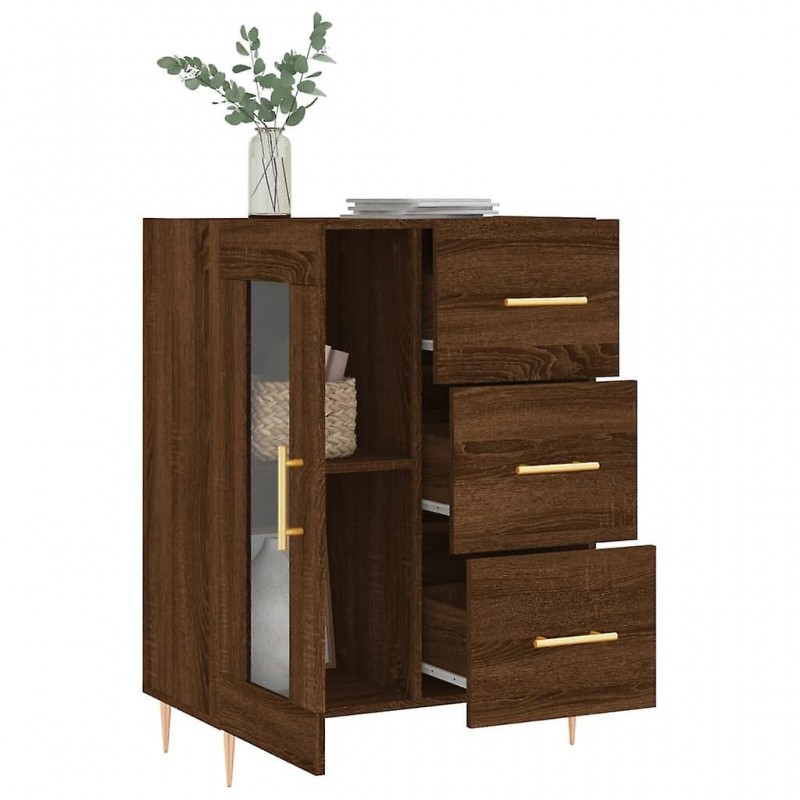 Con il suo design senza tempo, questa credenza classica è un'aggiunta perfetta alla tua casa. Materiale robusto: il legno è un materiale di altissima qualità con una superficie liscia caratterizzata da robustezza, stabilità e resistenza all'umidità. Ampio spazio di archiviazione: con 3 cassetti e 2 scomparti sul retro della credenza, dotata di un'anta in vetro, la credenza offre ampio spazio di archiviazione. Spazio per riporre ordinatamente vari oggetti di uso quotidiano a portata di mano. Presentazione: il robusto piano di questo mobile è ideale per esporre oggetti decorativi, quadri e piante in vaso. Pratica anta: puoi riporre i tuoi oggetti più importanti in questo mobile in modo elegante e organizzato per proteggerli dalla polvere. Gambe in metallo: le gambe in metallo gli conferiscono un aspetto gradevole e garantiscono sicurezza, garantendo al contempo stabilità. Attenzione: per evitare il ribaltamento, questo prodotto deve essere fissato con la staffa a parete in dotazione.