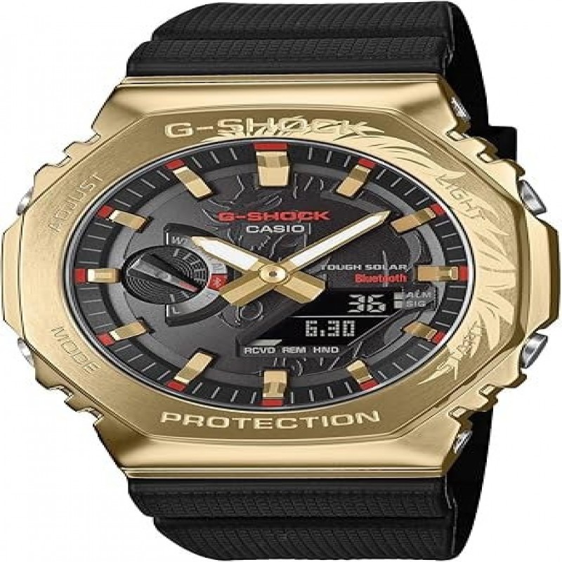 Dai il benvenuto al 2026 con stile. Festeggia l'anno del cavallo con un G-SHOCK davvero speciale, ispirato a quel potente simbolo di forza e bellezza: il mitico cavallo alato "mille li", che può galoppare per 500 chilometri, o 1.000 li, in un giorno. Un cavallo coraggioso ed eroico sfreccia sul quadrante, con l'incisione della criniera che si estende su una splendida lunetta placcata ionicamente color oro. Il risultato è un design straordinariamente dinamico e tridimensionale. Gli indici color oro simboleggiano il buon auspicio e lo splendore del nuovo anno, con punte di un rosso intenso che evoca la forza grintosa del cavallo da mille li. Le illustrazioni del mitico equino sul fondello e sulla confezione speciale completano questa elegante celebrazione dell'anno del cavallo. Dai il benvenuto al nuovo anno con un segnatempo dalla bellezza audace che coniuga robustezza ed estetica